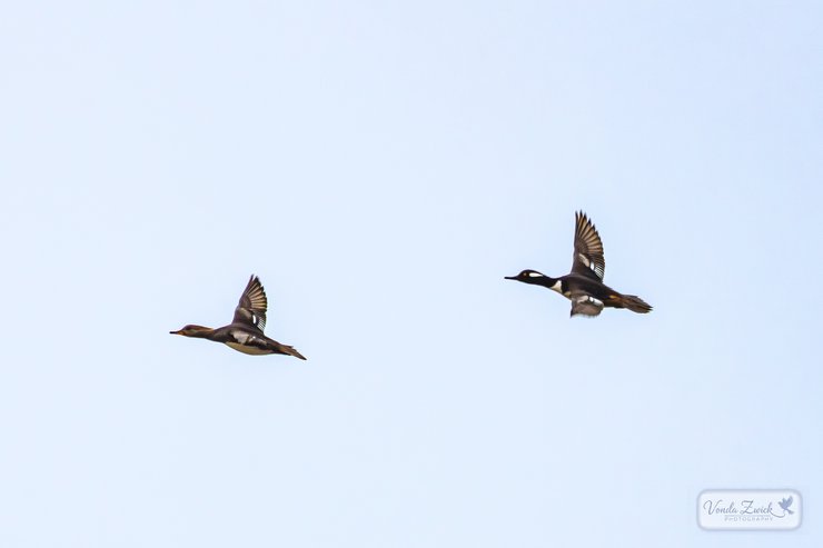 Hooded Mergansers: In flight at Ruth Macintyre Conservation Area